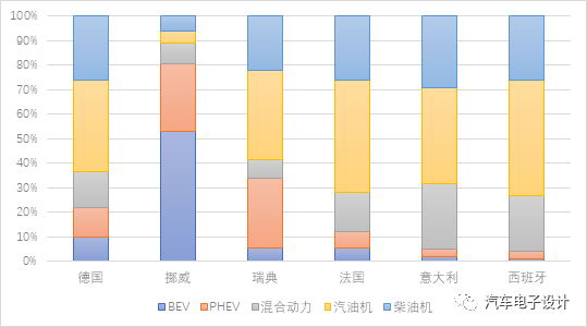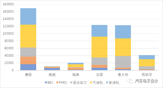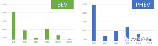 從新能源汽車的角度來看,德國、挪威、瑞典、法國和意大利的新能源汽車的銷售數(shù)量分別為36,903、8,309、6,893、14,654、6,254,西班牙稍少一些為1595臺(tái)。這個(gè)數(shù)據(jù)在去年年末沖量的基礎(chǔ)上開始回落,但是也是一個(gè)比較高的水平。