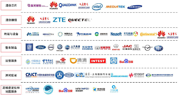 C-V2X產(chǎn)業(yè)鏈從狹義上來說主要包括通信芯片、通信模組、終端與設(shè)備、整車制造、測試認(rèn)證以及運營服務(wù)等環(huán)節(jié)。