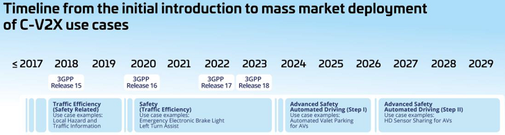 可以看到繼2020年C-V2X第一階段LTE-V2X部署應(yīng)用,未來3-4年是一個發(fā)展階段。同時,針對增強安全應(yīng)用和自動駕駛,業(yè)界預(yù)計將于2024-2027年開始商用部署。