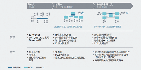 2015年,博世提出了眾所周知的電子電氣架構技術路線圖, 并描繪了未來電子架構的主要特征及可能的實現(xiàn)時間點。對于這一路線圖本身無需再做過多介紹,但其中的兩個重要標志性節(jié)點依然值得強調(diào),即DCU或HPC的出現(xiàn),以及統(tǒng)一的基礎軟件平臺的出現(xiàn),標志著EEA的本質(zhì)進化。盡管由于車企的解決方案各不相同,其對EEA進化的階段定義可能有所不同,但羅蘭貝格認為EEA的發(fā)展整體會經(jīng)歷三大階段:分布式架構、基于域的集中式架構和基于域融合的帶狀架構,如圖4。