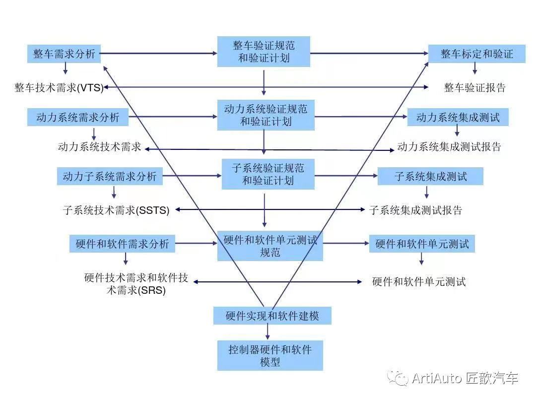 V流程來源于軟件開發(fā)過程中一個稱為快速應用開發(fā)的模型,由于該模型的構圖形似字母V,所以俗稱V模型。V模型是軟件開發(fā)、測試中最重要的一種模型,其大體可劃分為幾個不同的階段步驟,即功能需求、功能開發(fā)、軟件開發(fā)、軟件集成測試、功能集成測試、整車集成測試(系統(tǒng)合格性測試),如上圖所示。左邊為需求分析和設計開發(fā)的過程,右邊則為針對左邊的測試驗證。