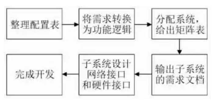 傳統(tǒng)EE架構(gòu)的開發(fā)流程如圖1所示,由市場首先對車型定位,針對定位尋找相應的或更高配置的主流車型進行對標,主要對標其外形、內(nèi)飾、靜態(tài)功能和動態(tài)功能并牽頭全員填寫競品分析表,將分析結(jié)果整合并調(diào)研用戶需求后整理輸出配置表、技術(shù)梳理配置表,找到各自的相關(guān)項,轉(zhuǎn)換為技術(shù)方案,將配置表分解為多個功能邏輯,再將功能邏輯分配給多系統(tǒng),輸出網(wǎng)絡(luò)通信需求表,根據(jù)需求表,輸出子系統(tǒng)的需求文檔,文檔中寫明I/O、人機交互界面、性能要求、應用場景等,子系統(tǒng)根據(jù)功能分配自己的網(wǎng)絡(luò)接口和硬件接口,最后完成系統(tǒng)的原理圖和網(wǎng)絡(luò)開發(fā)。