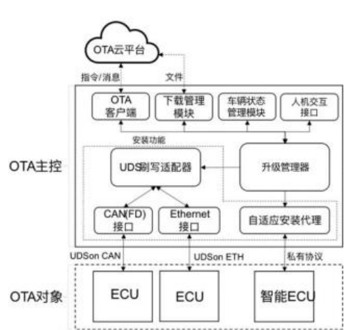 ② 車輛控制:對于影響車輛安全的升級,整個(gè)升級過程需要保持在一種安全狀態(tài),因此, OTA 主控需要具備一定車輛功能控制能力,根據(jù)不同的升級類型,控制車輛的功能狀態(tài)。