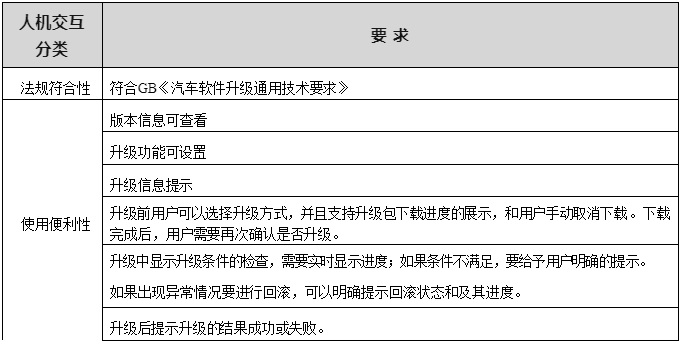 車端的人機(jī)交互主要體現(xiàn)在信息娛樂系統(tǒng)上,覆蓋到 OTA 的整個(gè)過程,包括信息提示、用戶確認(rèn)、關(guān)鍵信息顯示等。人機(jī)交互過程需要考慮的要素大致可以分為兩個(gè)方面,即法規(guī)符合性和使用便利性,如表 2-8 所示。