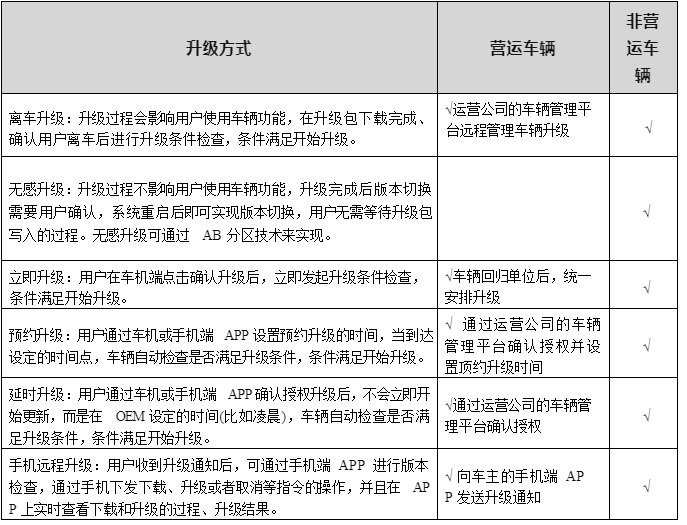 基于實(shí)際業(yè)務(wù)要求,各家 OEM 的 OTA 人機(jī)交互方式各有差異,本節(jié)共總結(jié) 6 種主流升級方式,并針對營運(yùn)車輛與非營運(yùn)車輛使用性質(zhì)不同,分別展開分析,具體如表 2-10 所示。