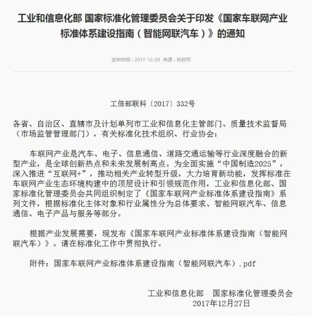 日前,工業(yè)和信息化部國家標(biāo)準(zhǔn)化管理委員向各省、自治區(qū)、直轄市及計劃單列市工業(yè)和信息化主管部門、質(zhì)量技術(shù)監(jiān)督局(市場監(jiān)管管理部門),有關(guān)標(biāo)準(zhǔn)化技術(shù)組織、行業(yè)協(xié)會下發(fā)了《國家車聯(lián)網(wǎng)產(chǎn)業(yè)標(biāo)準(zhǔn)體系建設(shè)指南(智能網(wǎng)聯(lián)汽車)》的通知。
